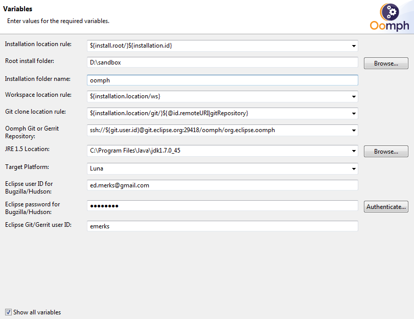 In this case the installation will end up in the 'D:/sandbox/oomph' folder. |