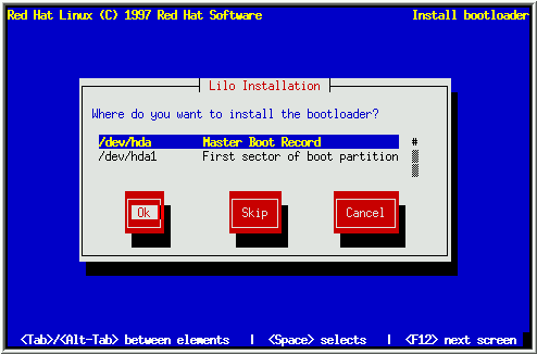Please Note: If you choose Skip, you will not be able to boot your Red Hat Linux system directly, and will need to use another boot method (such as a boot diskette). Use this option only if you know you have another way of booting your Red Hat Linux system!