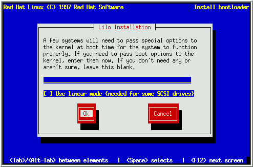 Next, the installation program will ask if you wish to add default options to the LILO boot command (see Figure 46). Any options you enter will be passed to the Linux kernel every time it boots. When you reviewed your computer's BIOS settings in Section 2.3.1, if you found your computer accesses a hard drive in LBA mode, check Use linear mode. Select OK and press [Space] when finished.