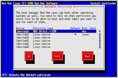 There is also a column labeled ``Default''. Only one partition will contain an asterisk under that column. The partition marked as the default will be the partition LILO will boot if there is no user input during the boot process. Initially the root partition for your Red Hat Linux installation will be selected as the default. If you'd like to change this, use the arrow keys to highlight the partition you'd like to make the default, and press [F2]. The asterisk should move to the selected partition. When you've finished, select Ok, and press [Space].