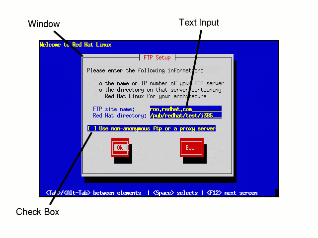 You navigate through the installation dialogs using a simple set of keystrokes. To move the cursor, use leftarrow, rightarrow, uparrow, and downarrow. Use Tab, and Alt-Tab to cycle forward or backward through each widget on the screen. Most screens display along the bottom a summary of available cursor positioning keys.