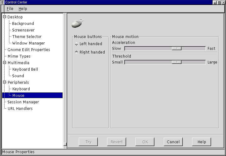 The Mouse Properties capplet allows you to change between left and right handed mouse buttons and to define the Accelerations and Threshold properties.